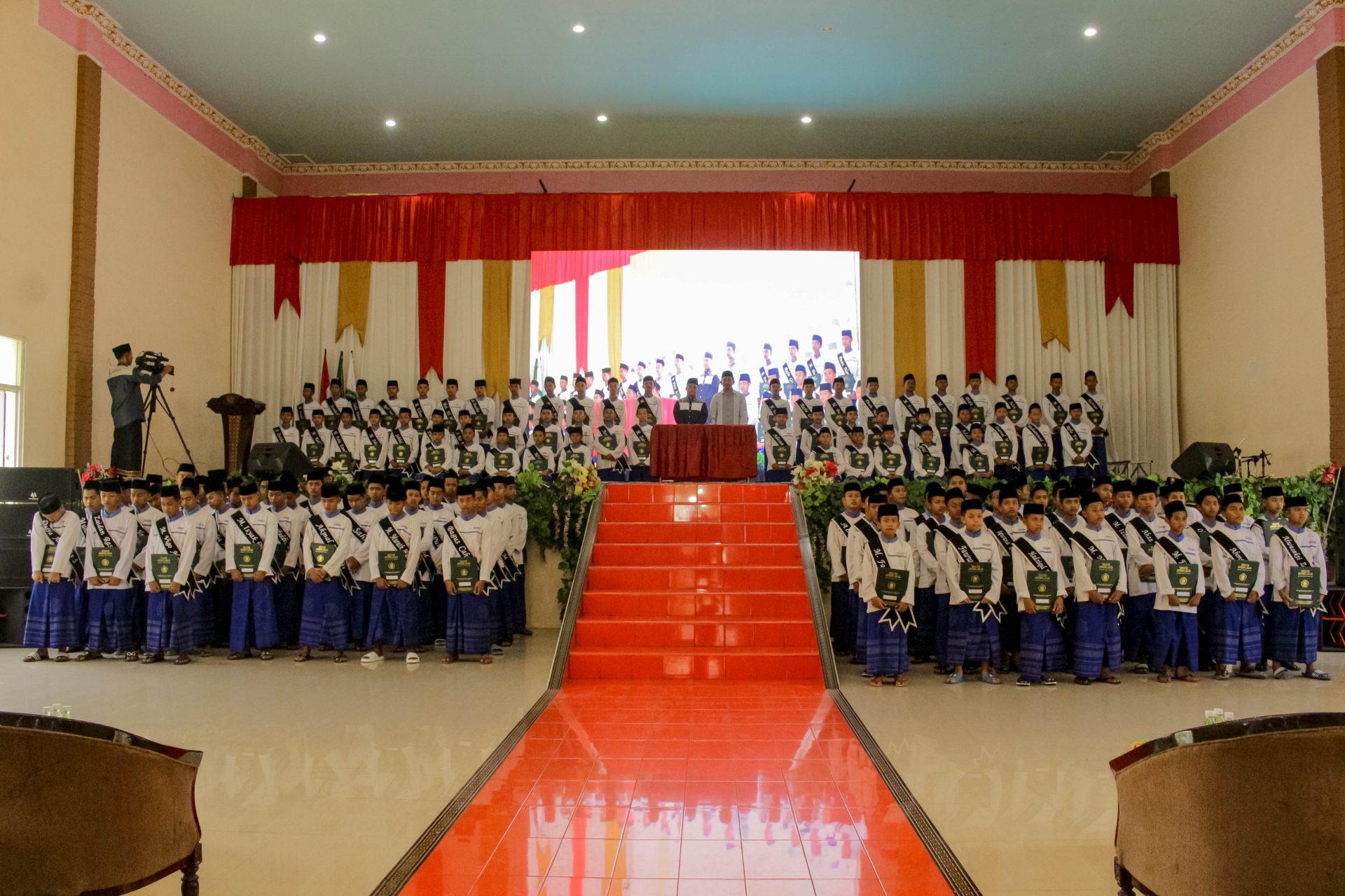 Suara riuh dari wali santri yang sudah masuk gedung lebih dulu terdengar memenuhi ruangan saat wisudawan memasuki ruangan. Beberapa ada yang bertepuk tangan melihat anaknya memasuki ruangan. Ada juga yang menjadi jurnalis pribadi dadakan putra mereka.