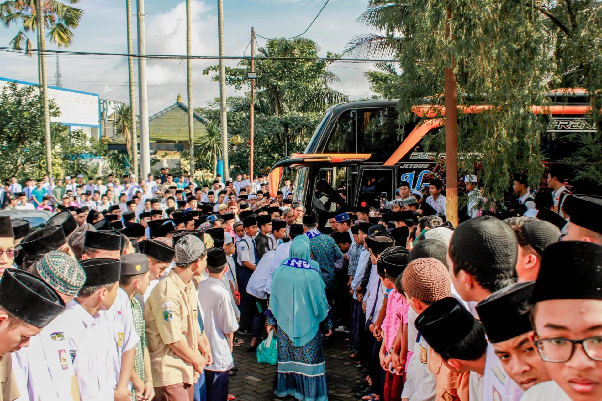Tak lama setelah itu, para jemaah beranjak dari teras masjid dan menuju bus pengantar. Seketika para santri mendekat dan membuat jalan hingga menuju pintu bus. Di sinilah suasana haru terurai. Dalam perjalanan menuju bus, air mata haru menggenang di pelupuk mata para jemaah, ada juga yang sampai mengalir. Bahkan ada seorang anak salah satu dari mereka yang menangis karena ibunya akan berangkat ziarah rasul.